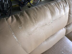 この状態、合皮が使われているソファーでよく起こる事例で生地自体が劣化してきて加水分解を起こしている状態となり、この状態になってしまうと表面が今回のようにボロボロ剥がれてきたり、べたついたりしてきます。