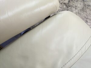 今回は左側の肘掛けがひび割れの劣化が進んでおり、かろうじてまだ革が破れていない状態でしたが、革の強度も弱ってきていたため、今回は費用を抑える為裏側から革をあて補強する形で対応しています。その為、ひび割れの補修跡はどうしてもよく見ると残ってしまいます。