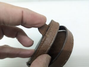今回の修理は、ミシンでは縫えない構造なので手縫いで一針ずつ丁寧に元の糸目の穴を通して縫い直しています。