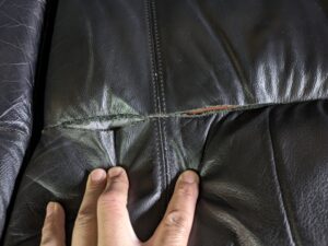 画像をご覧の通り、酷いひび割れや色剥げなどはないのですが、縫製の縫い目に沿って革が裂けて破れてしまっていますね。